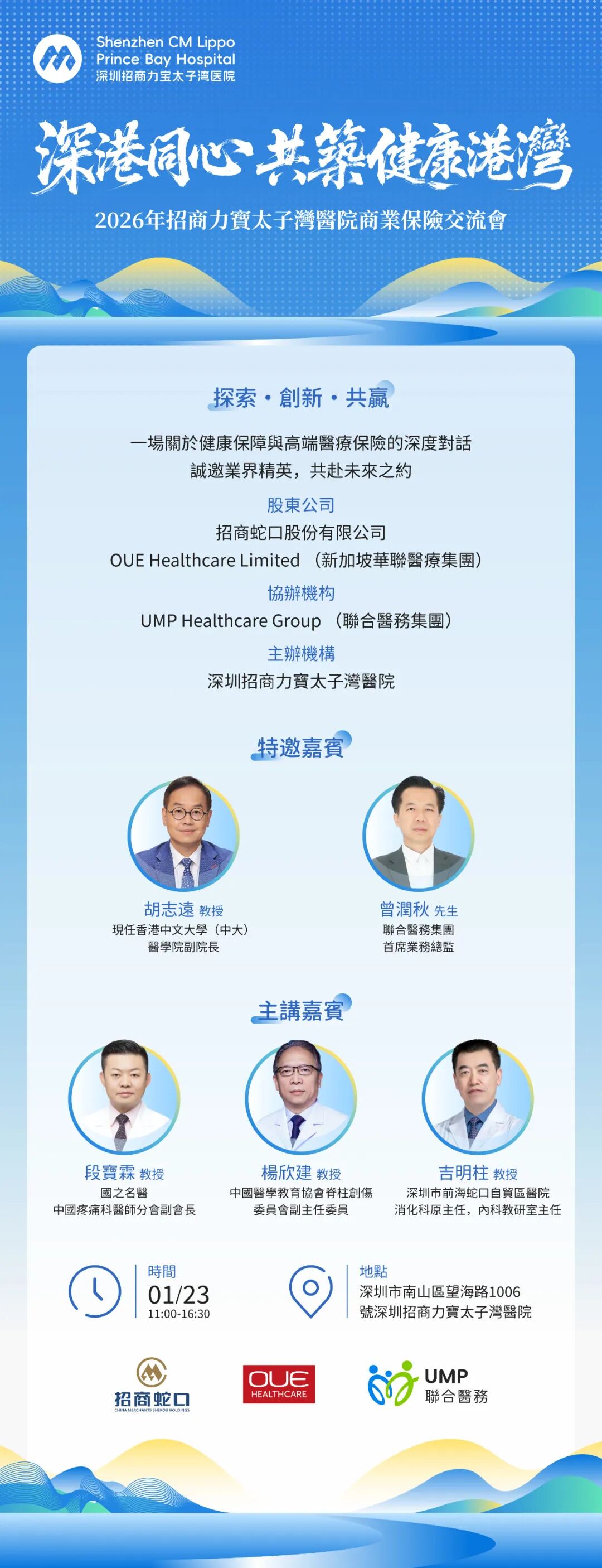 在粤港澳大湾区蓬勃发展的浪潮中,医疗健康正成为连接两地、普惠民生的重要纽带。2026年1月23日,一场汇聚深港智慧的高端对话——“招商力宝太子湾医院商业保险交流会” 将在深圳南山盛大启幕。